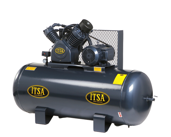 Compresores desde 1 HP hasta 40 HP, operando hasta 250 PSI con un 75% de eficiencia. Disponibles con motor eléctrico, cabeza de hierro gris y tanques de hasta 1,000 litros.