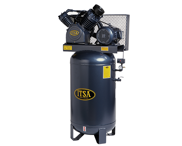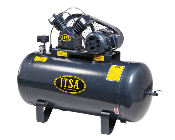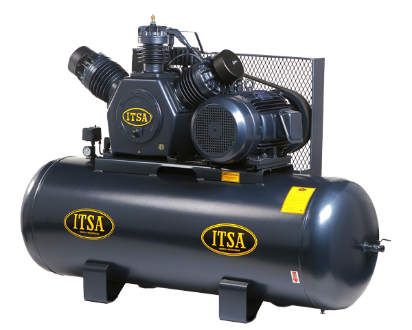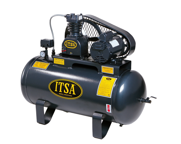 Compresores desde 1 HP hasta 40 HP, operando hasta 250 PSI con un 75% de eficiencia. Disponibles con motor eléctrico, cabeza de hierro gris y tanques de hasta 1,000 litros.